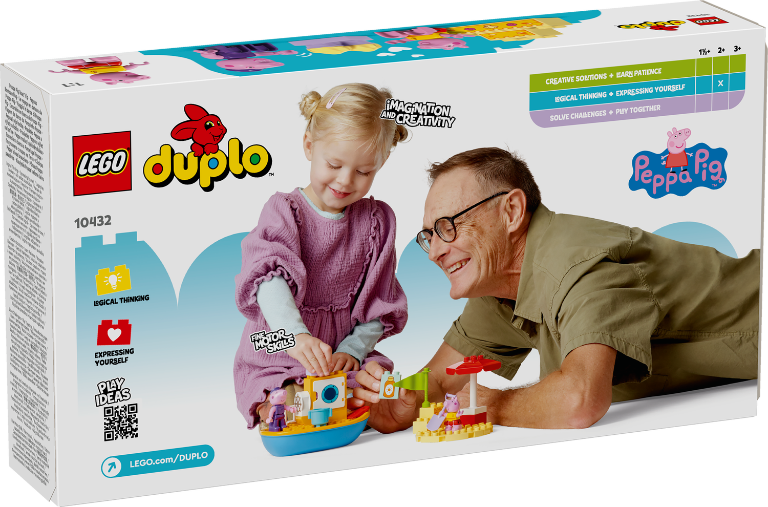 All aboard the LEGO® DUPLO® Peppa Pig Boat Trip Toy (10432) for hours of joyful preschool learning. Girls and boys aged 2+ join the Grandpa Pig and Peppa Pig figures as they head to the beach with his boat.