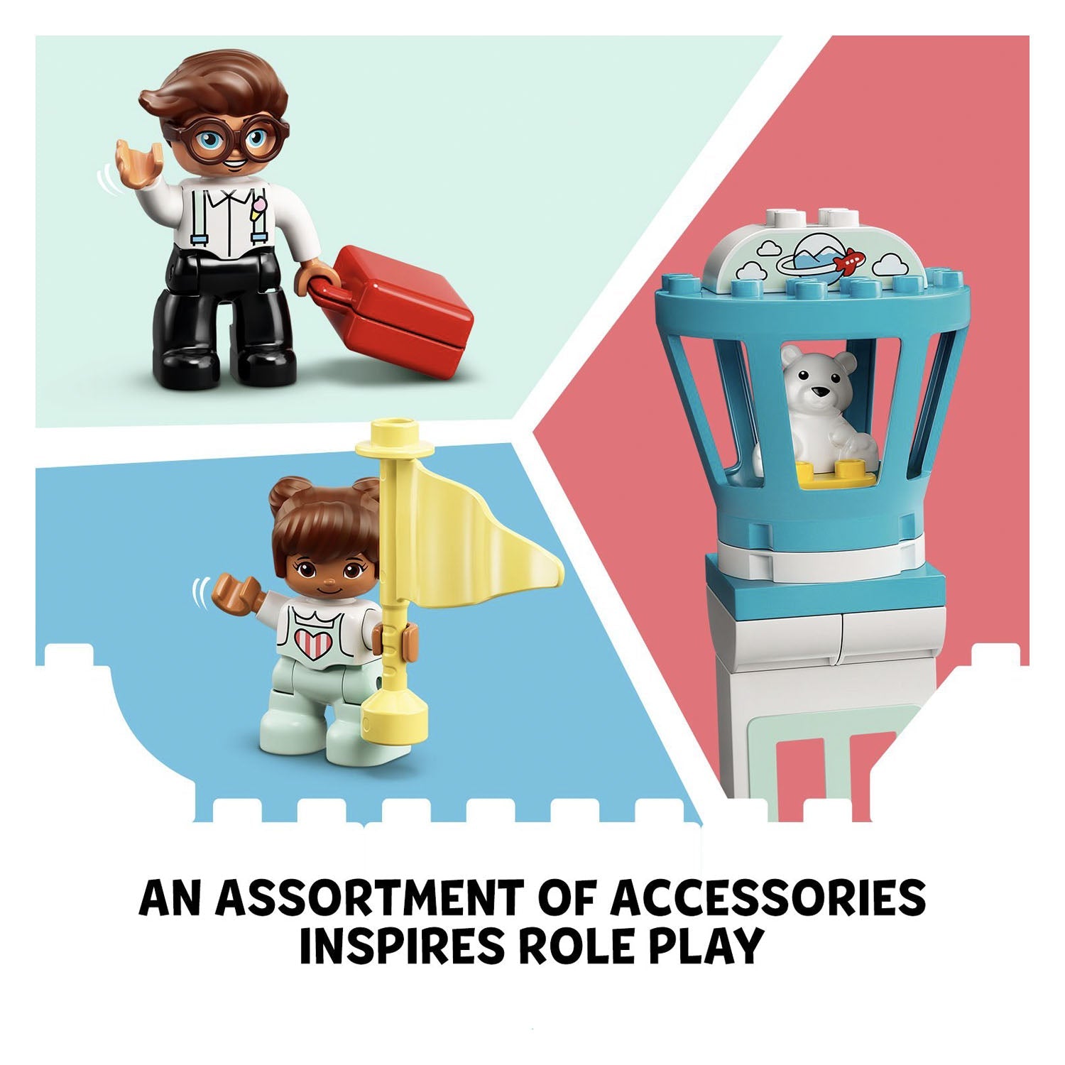 - Includes 3 DUPLO® figures – dad, girl and a pilot – an airplane with a removable roof and a rotatable airport control tower with luggage slide.