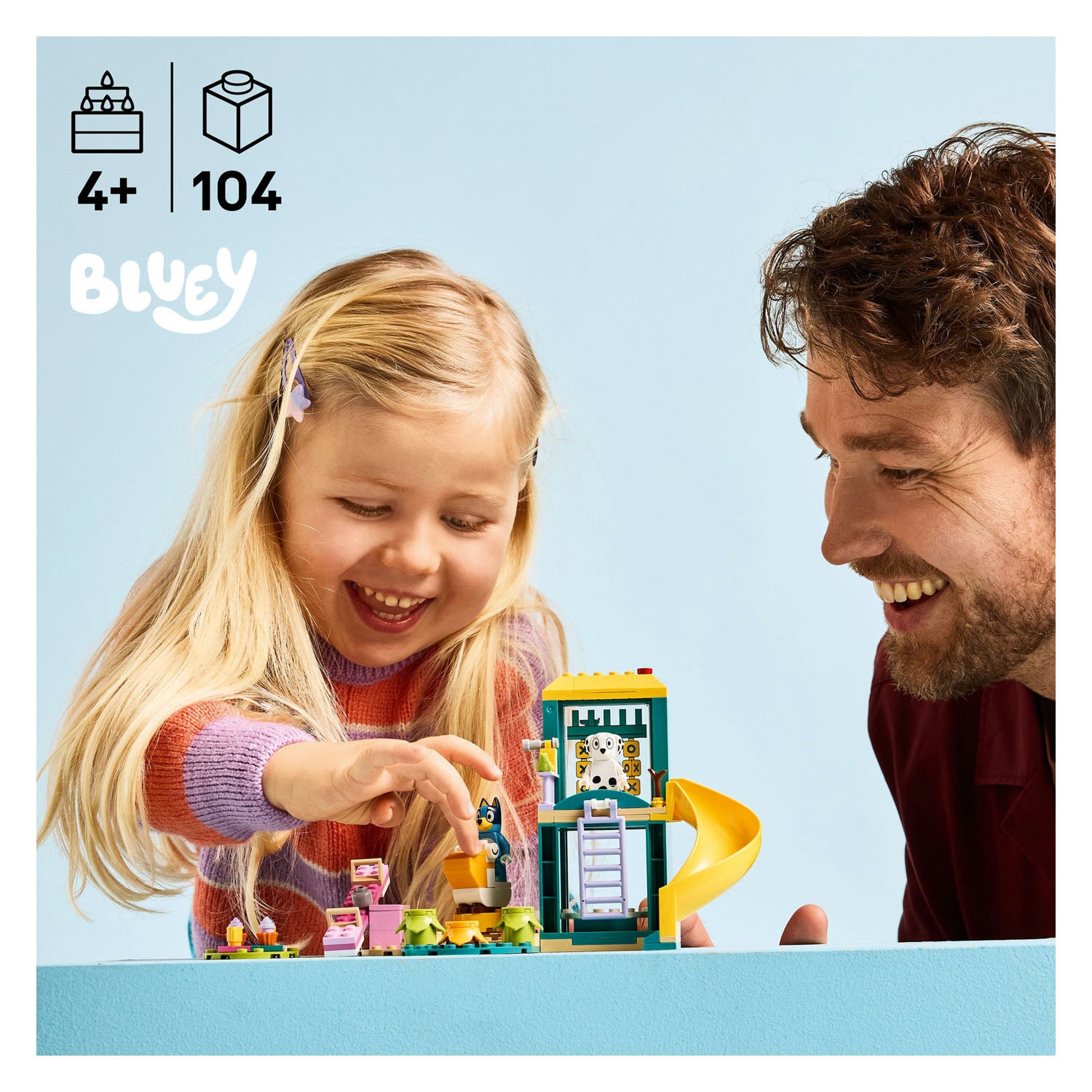 - Interactive toy for kids aged 4 and up – Fans of the Bluey TV show join Bluey and Chloe minifigures in a vibrantly colored playground, complete with seesaw, slide, jungle gym and more