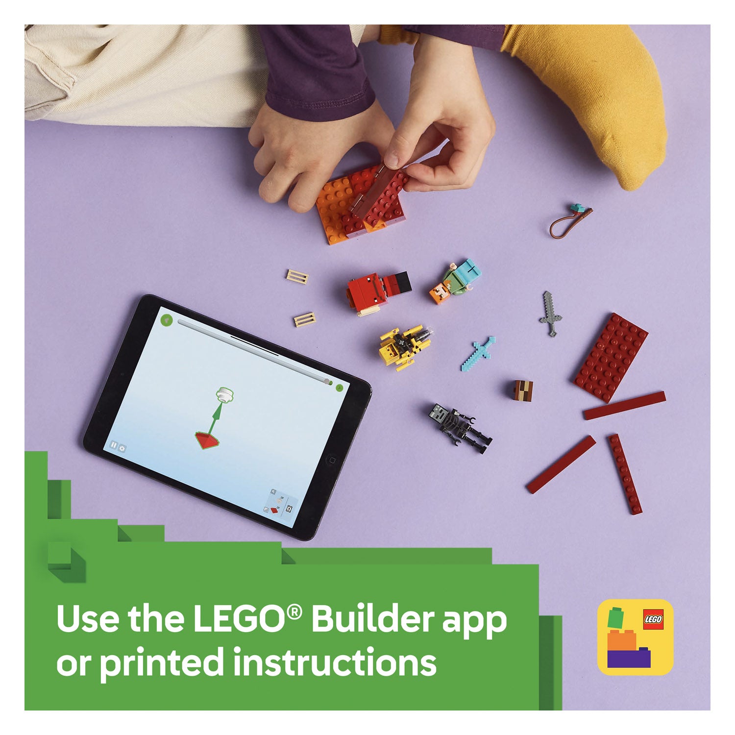 The Nether Lava Battle (21266) is a small LEGO? Minecraft? set that provides a build-and-play version of the popular video game. This versatile Minecraft activity set features popular gaming figures, fun features and endless action, making it the perfect treat for kids aged 6 and over. Kids join Minecraft action hero Alex on a mission to remove ancient debris from a section of the Nether fortress bridge in the crimson forest. When the debris is removed, lava elements automatically cascade down, and Minecraft figures ? a stone-sword-wielding wither skeleton and a rod-spinning blaze ? block Alex?s escape. Kids use an iconic diamond sword to battle the mobs before fleeing on another Minecraft figure, a strider, which features posable legs and a saddle. Minecraft players know they must grab hold of some warped fungus to be able to steer the strider. For extra digital fun, the LEGO Builder app lets kids zoom in and rotate models in 3D using their device.