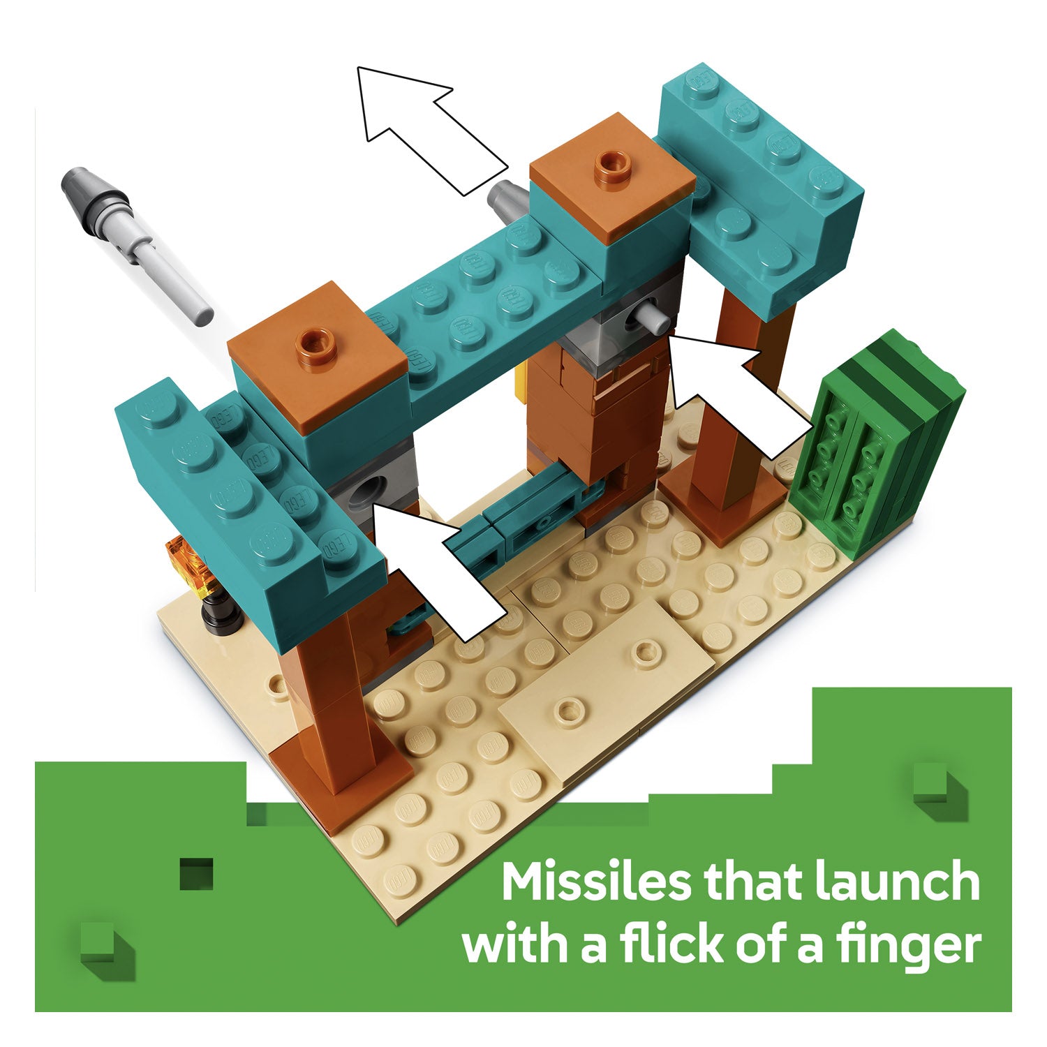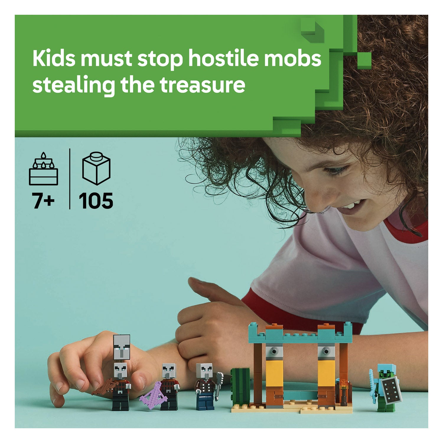 There?s big fun for Minecraft? players in this small LEGO? set for kids aged 7 and over. With 4 LEGO Minecraft figures, fun features and authentic accessories, The Illager Desert Patrol (21267) is a mini toy with mega Minecraft action. Set in a Minecraft desert outpost, kids role-play being a Cactus Knight, with its diamond armour and shield and sword. When 3 illager figures arrive to steal treasure, kids must defend the outpost. The set includes missiles that kids can launch with a flick of their finger, a variety of weapons and a barrel that holds the treasure. For extra digital fun, the LEGO Builder app lets kids zoom in and rotate models in 3D using their device.
