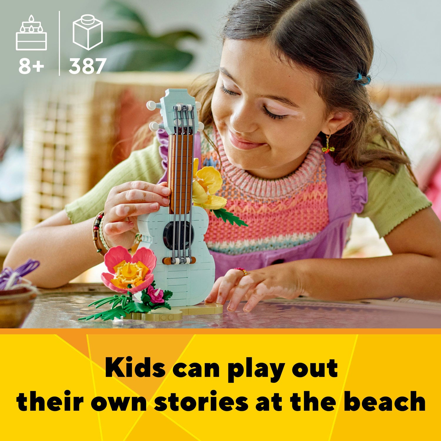 - 3 beach models including a surfboard toy in 1 set – Girls and boys aged 8+ build and rebuild 3 different beach models using the same bricks with the LEGO® Creator Tropical Ukulele instrument toy