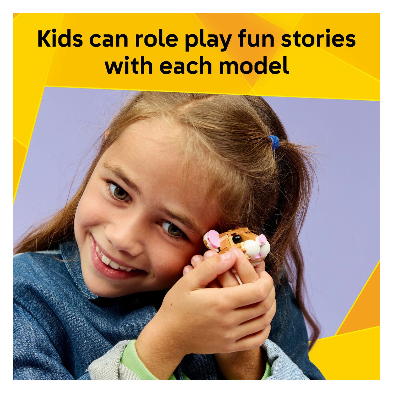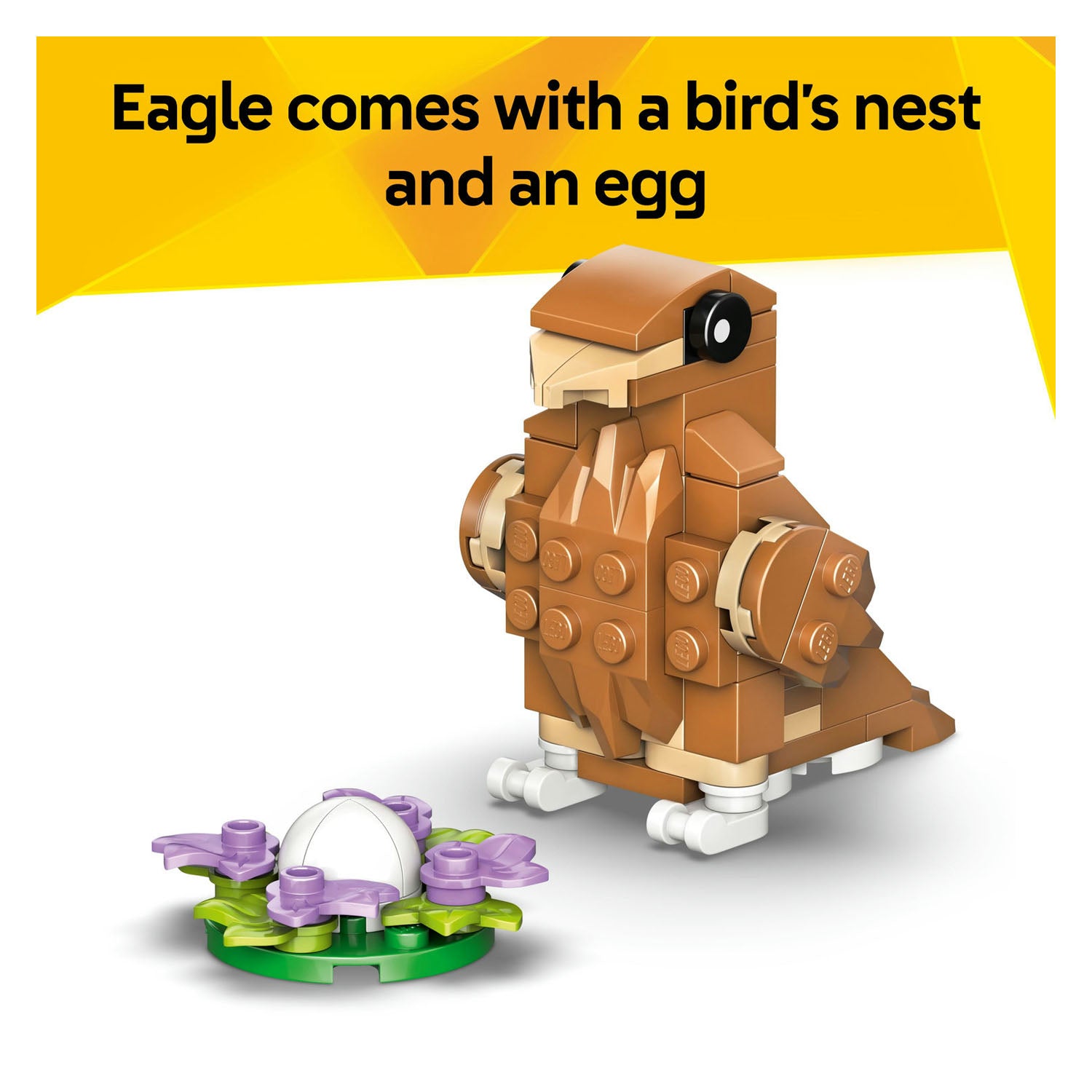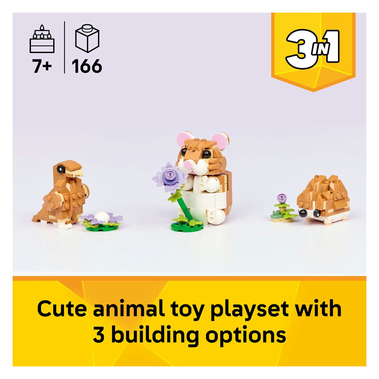 Enjoy fun-filled adventures with 3 LEGO® animals! Play with a cute hamster and a beautiful purple flower. Then rebuild it into an adorable hedgehog with a flower or a friendly eagle guarding its egg. What will you build? The choice is yours with this amazing 3 in 1 animal playset.