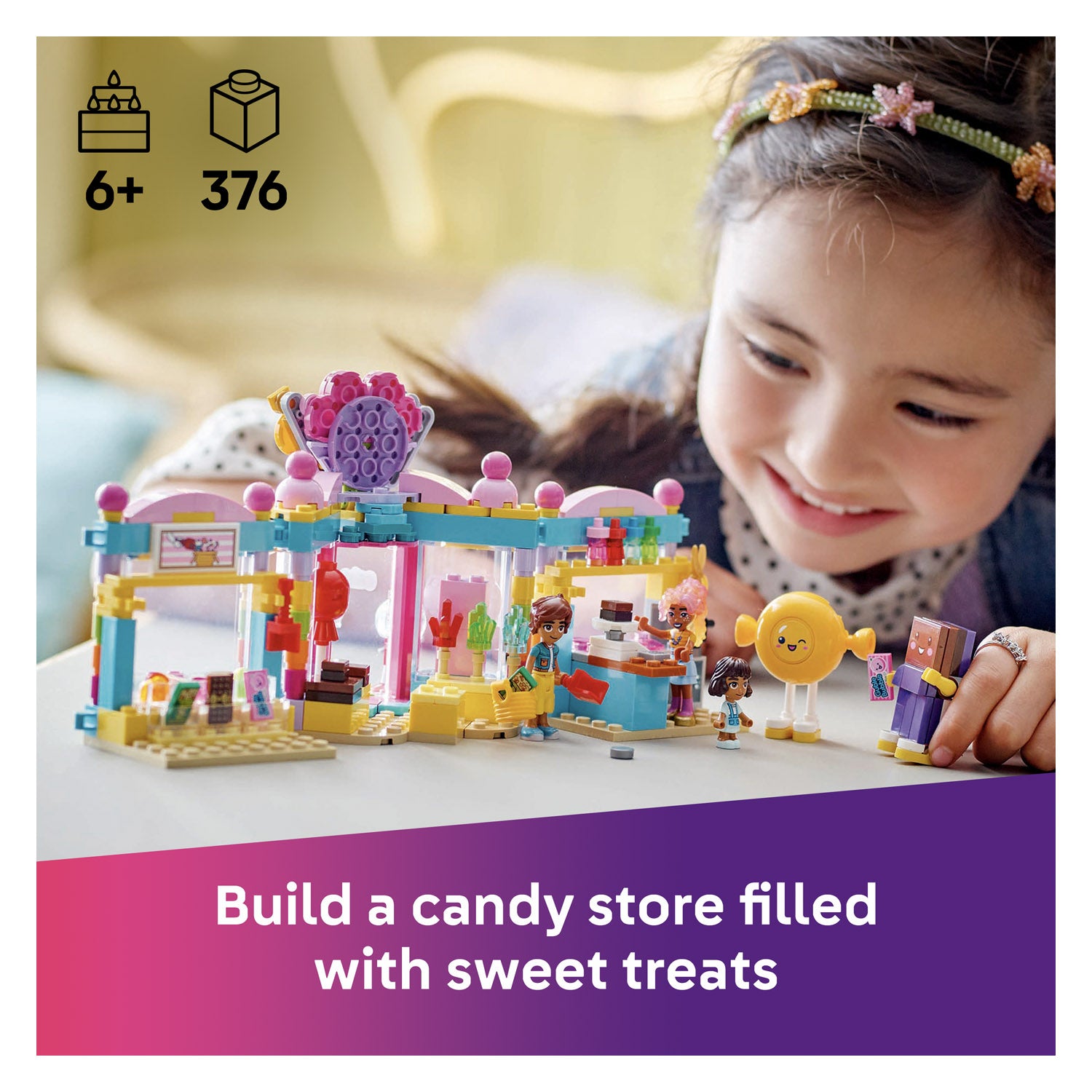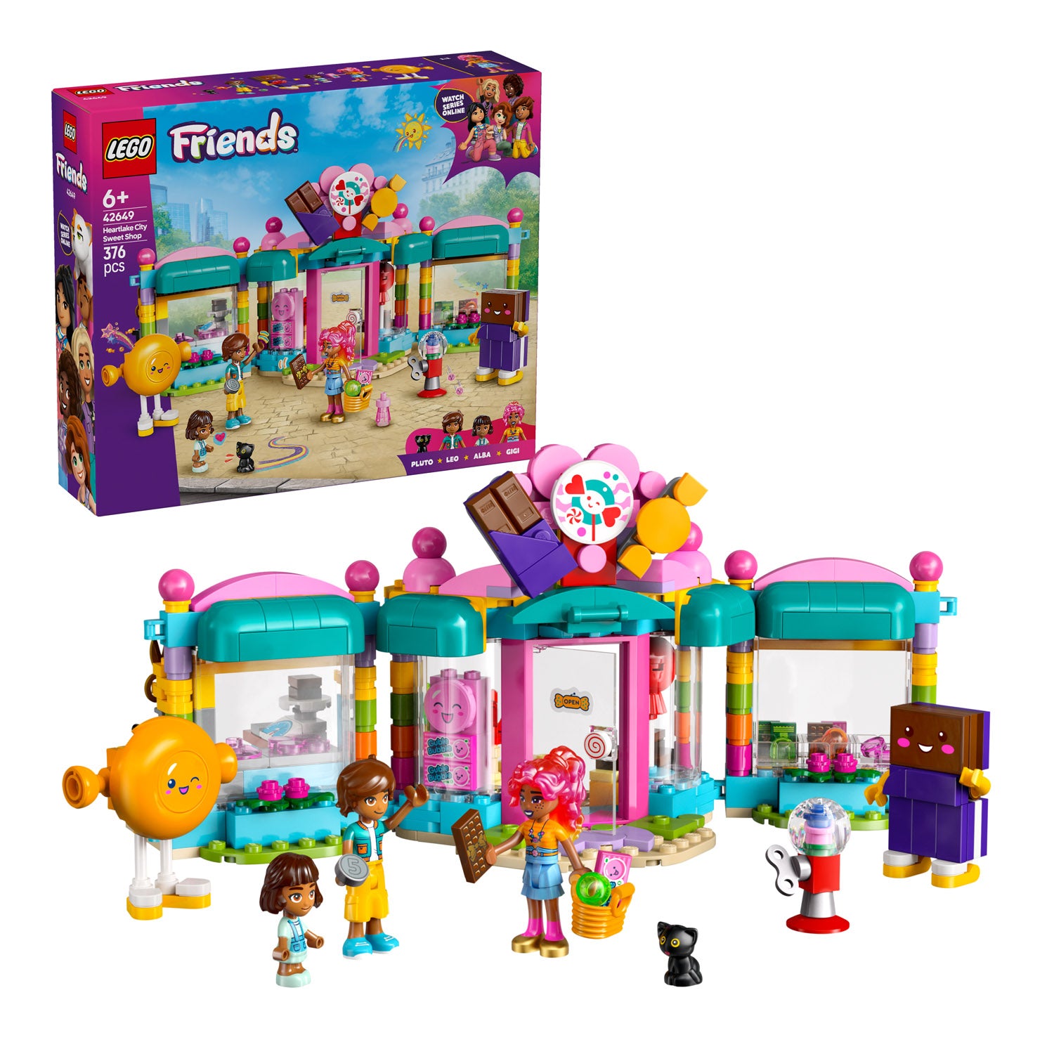 Here?s a sweet birthday gift for kids aged 6 and over who love pretend-play sets and shop toys. Girls, boys and young builders can explore the LEGO? Friends Heartlake City Sweet Shop (42649), which is packed with goodies and fun details. The set comes with 2 minidolls, a micro-doll, a cat figure and lots of accessories for creative play. This set is a great toy for supporting kids? social development skills. Your young builder can act out customer interactions or create sibling stories with Leo and his younger sister, Alba. The set is packed with sweet shop-themed features, like the pick ?n? mix selection, the giant lollipop, a gumball machine and a cash register. There?s also a sweet-making area with ingredients, scissors and a cooking pot. And who could resist saying hello to the store?s two mascots ? a chocolate bar and a wrapped sweetie? Discover more fun toys in the LEGO Friends universe (sets sold separately) with diverse characters and friendship stories to discover.