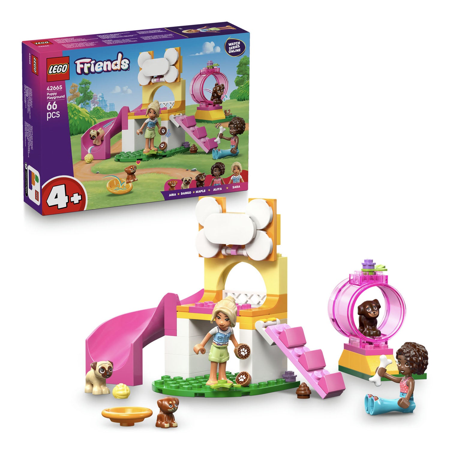 2 LEGO® Friends minidolls and 3 dog figures – This set comes with Aliya and Sara minidolls, plus puppies Aira, Dango and Maple so kids can explore social situations and create friendship stories