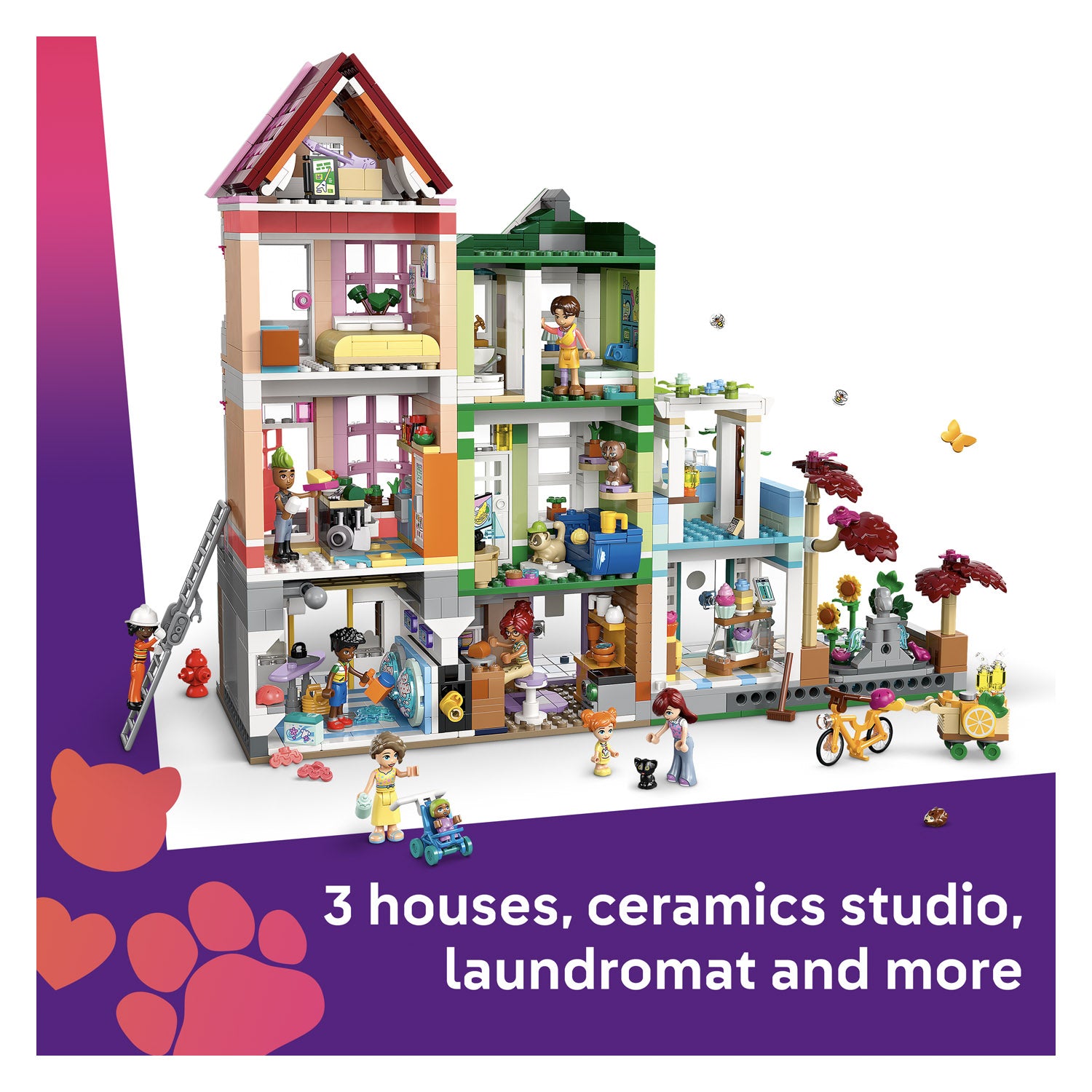 Discover a model kit full of community spirit with the LEGO? Friends Heartlake City Apartments and Stores (42670) buildable toy. This set makes a great gift for kids aged 12 years old and over and includes 3 colourful LEGO houses, a bakery, a ceramics studio, a launderette and much more. There are lots of fun details and storylines to discover, plus 9 characters, including 7 minidolls and 3 cat figures. Meet friends Paisley, Zac and Ella at their lemonade stand. Then call in on the cat-lover, who has a house full of cat treats. Say hello to the young family and look out for the firefighter figure who?s on hand in case a cat gets stuck in a tree. The apartments are full of fun details that are personalised to the characters. The launderette has a rolling door and 2 spinning washing machines. The ceramics studio comes with a spinning pottery wheel. The bakery has treats for sale and the community park features a fountain, flowers and a table where the characters play chess.