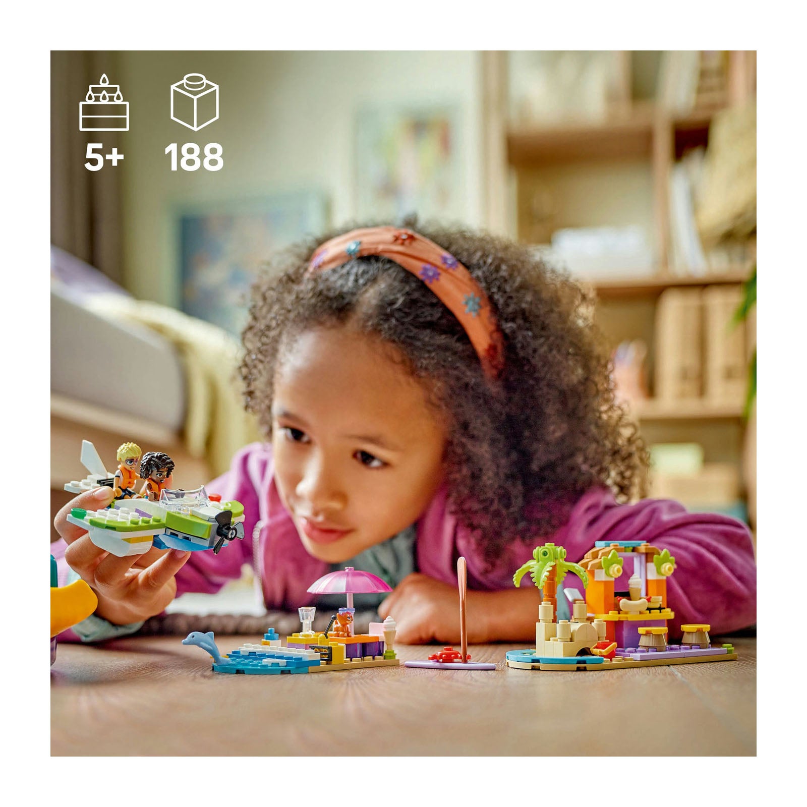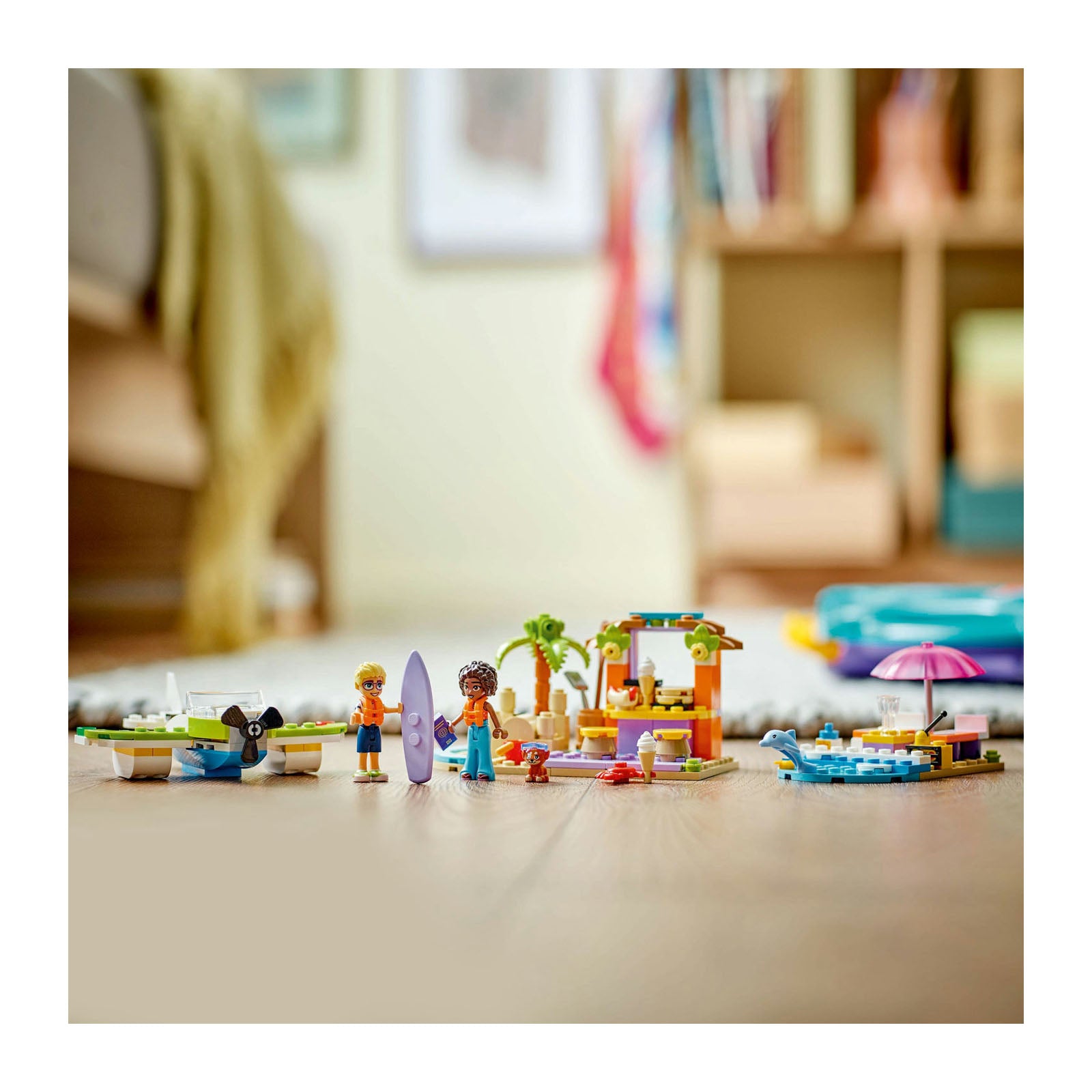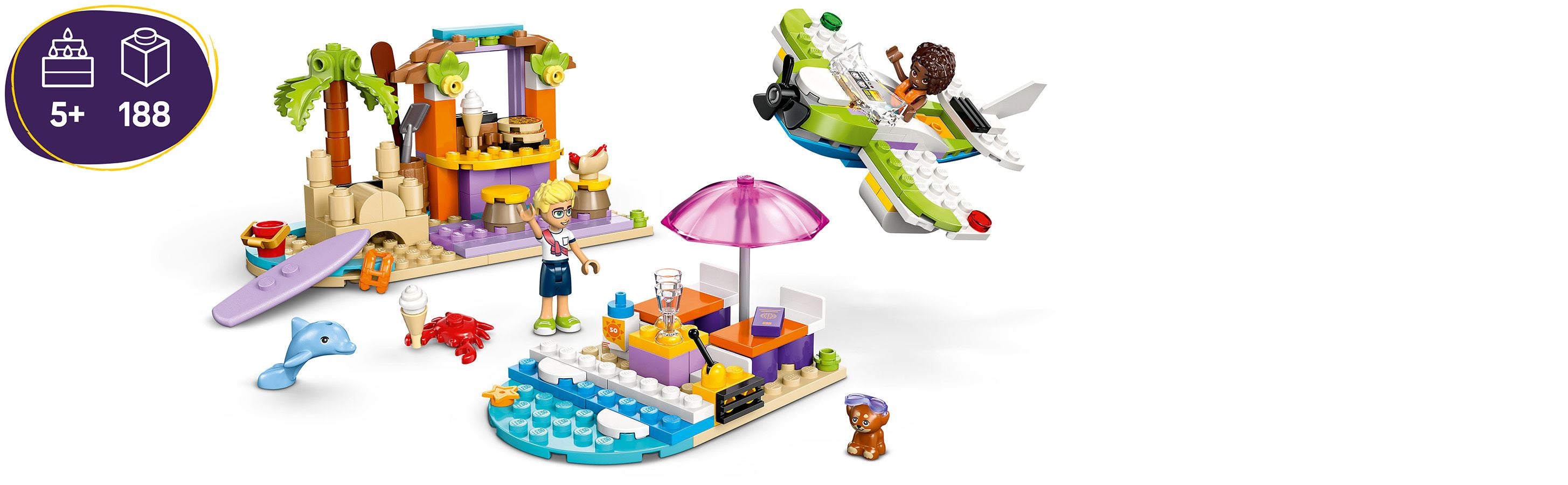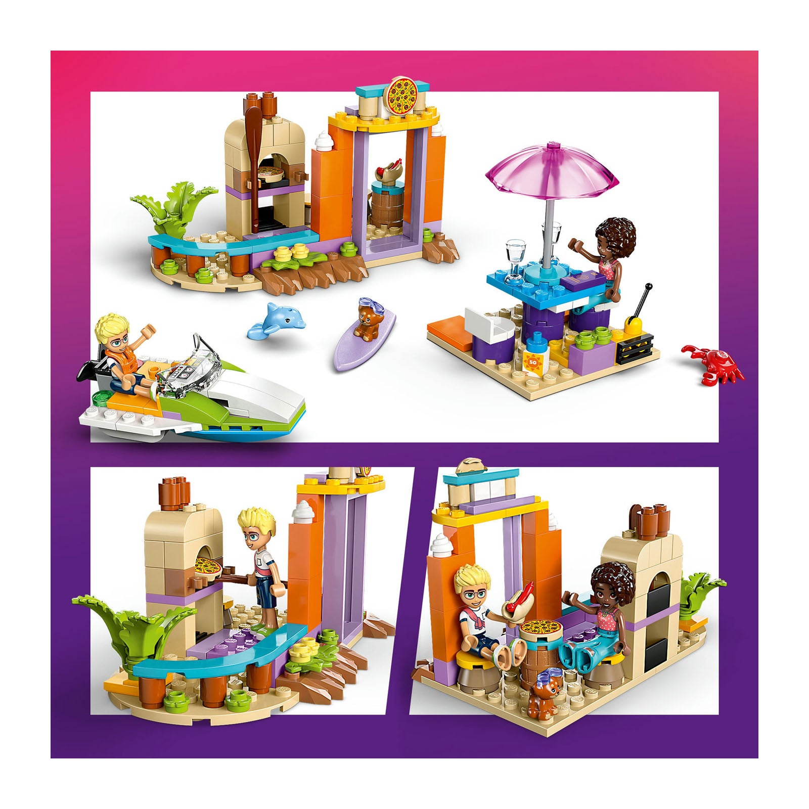 - Build, then rebuild – The set includes a beach scene with a seaplane, relaxation area and beach café hangout, which rebuilds into a new scene with a speedboat toy, an outdoor seating area and a pizza shop