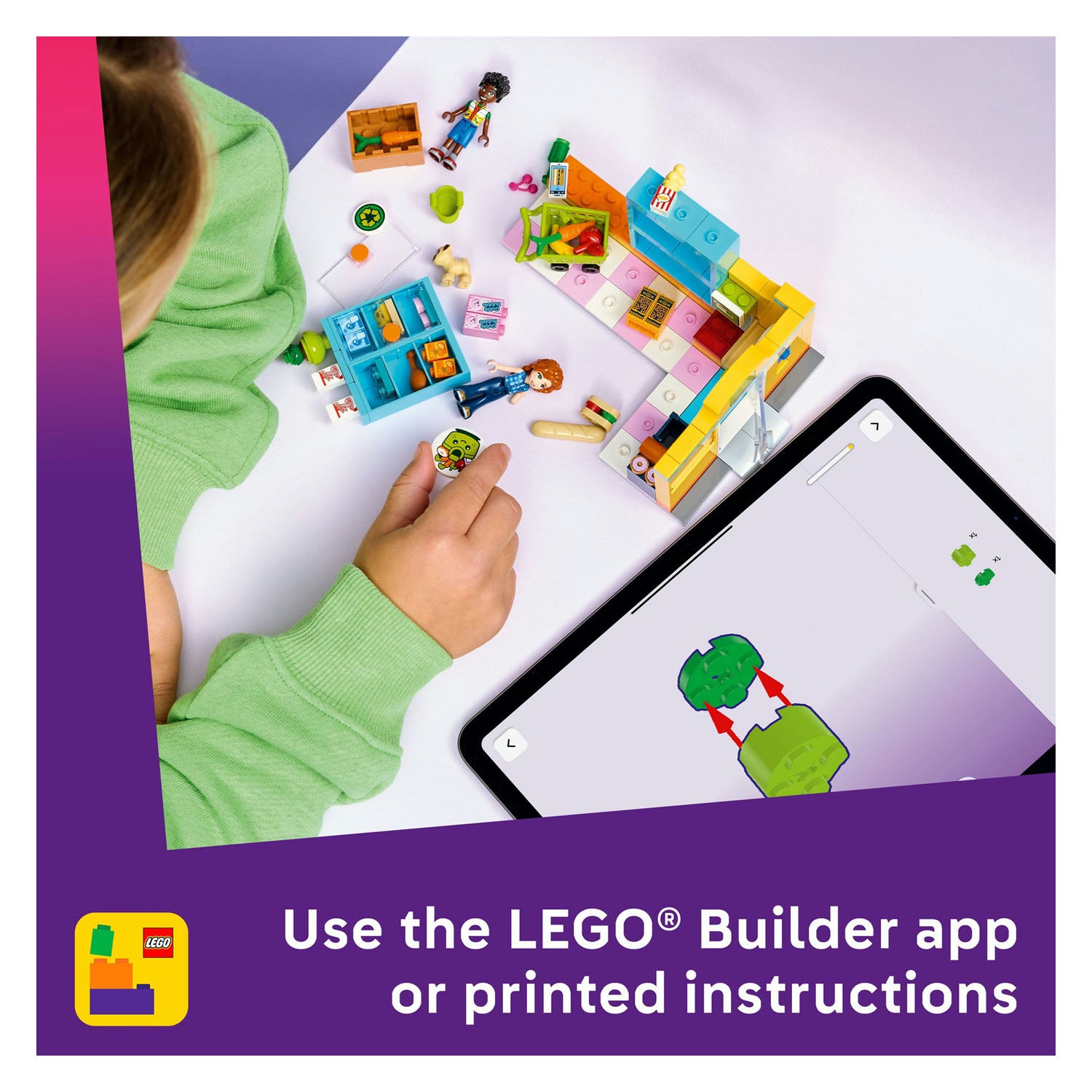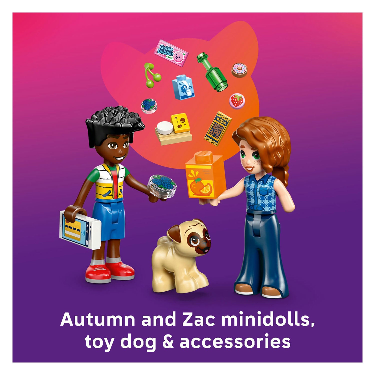 Let’s go grocery shopping! The LEGO® Friends Heartlake City Convenience Store has everything you need. Look – Dango the dog is here with Autumn and Zac. They use the shopping cart to choose their favorite foods, including donuts, fruit, juice, carrots, milk and more. After paying for their items, they visit the recycling point to recycle an empty bottle. What a fun shopping trip!