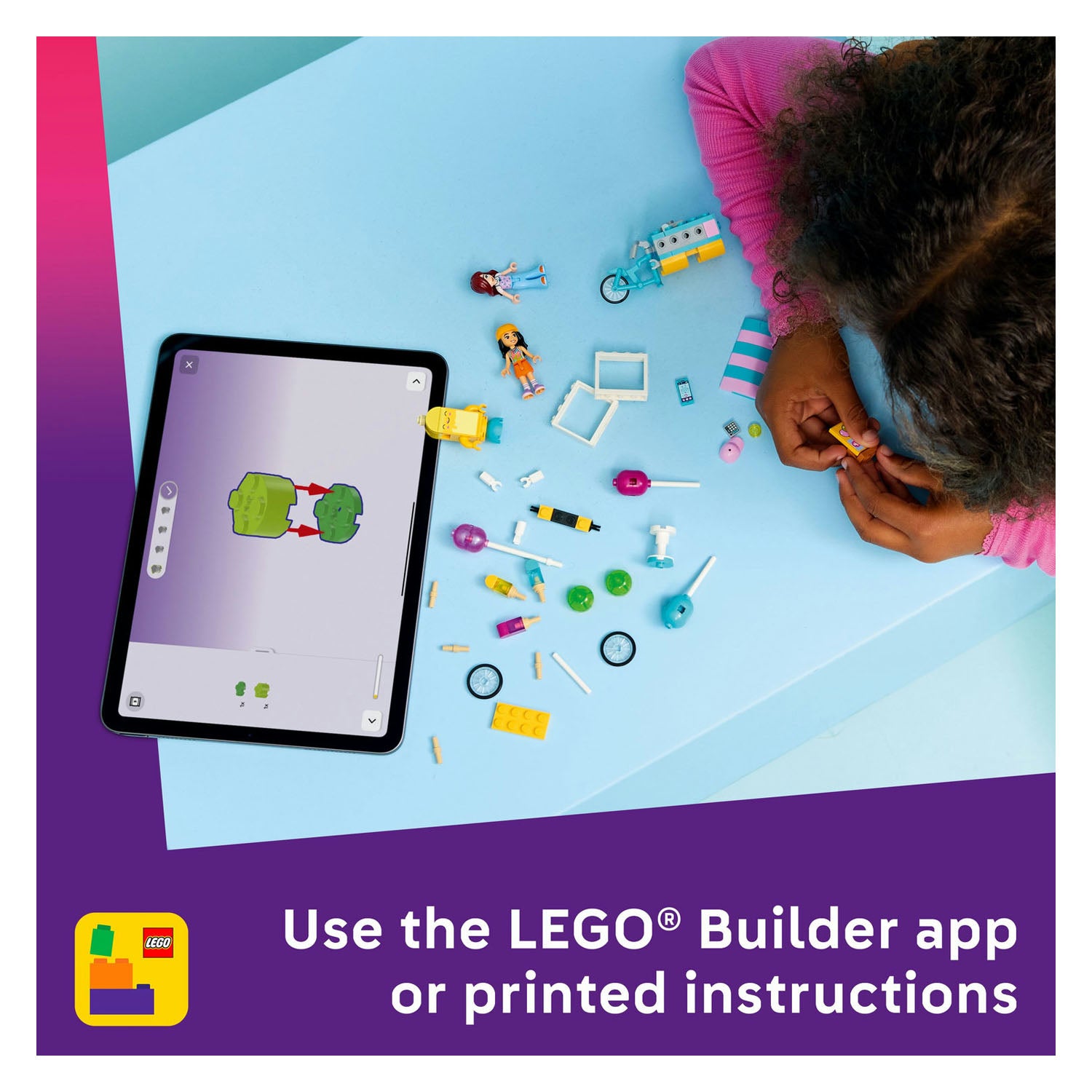Who’s ready for balloons and ice pops? Join friends Paisley and Liann as they buy and sell treats at the LEGO® Friends Ice Cream & Balloon Stand. Help Liann ride the bike to steer the stand into position. Then it’s time to sell to customers. Look, here’s Paisley! What will she choose? After paying, Paisley meets the cute ice pop mascot, then heads to the table to chill with her friend.
