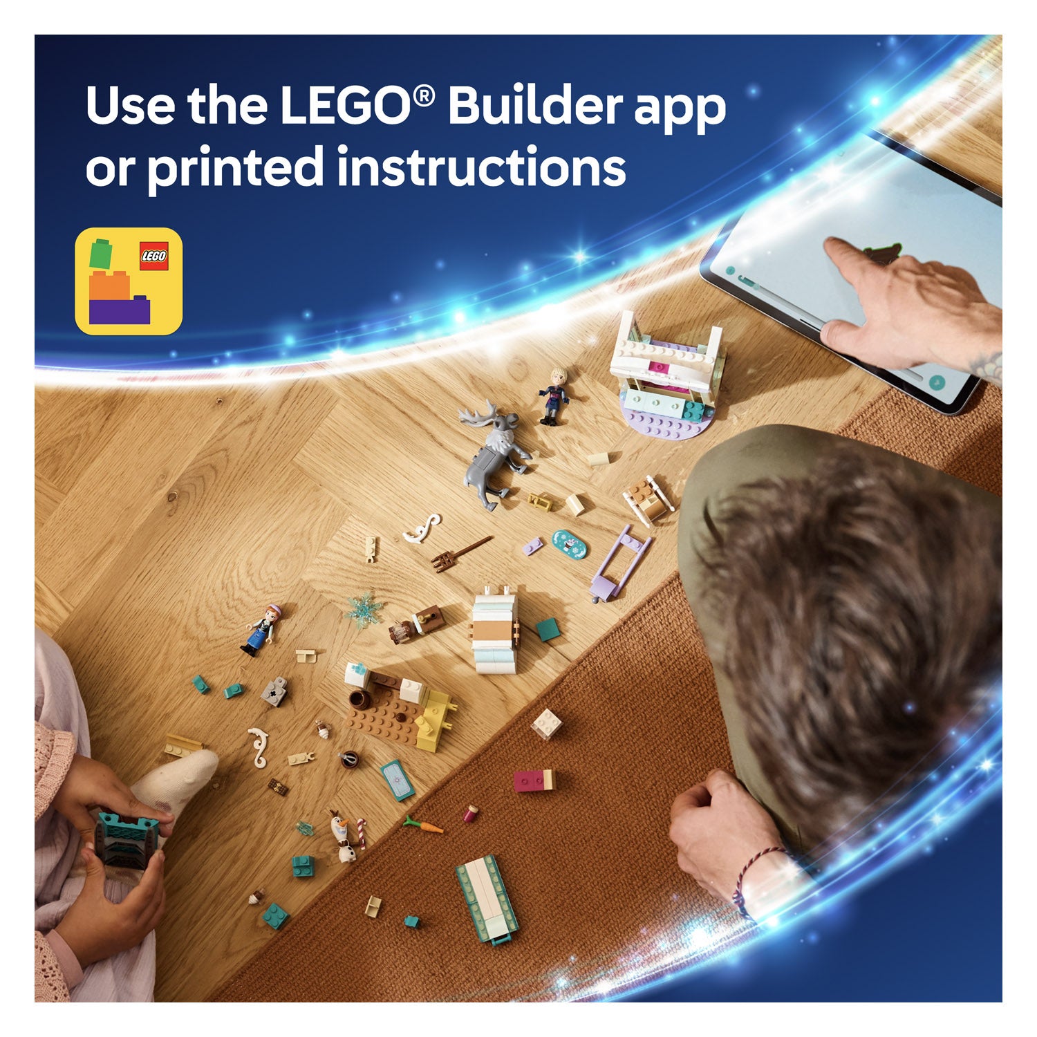 Winter fun awaits Disney's Frozen fans aged 4 and over as they learn to build with this LEGO? ? Disney Frozen Anna's Sleigh Adventure (43256) building playset, with a hot chocolate stand, stable, sleigh, small sledge, sledging hill and other fantasy building toy items. It also has 4 characters: Anna and Kristoff LEGO ? Disney mini-doll figures, an Olaf LEGO Disney snowman figure and a Sven LEGO ? Disney animal figure. Fulfil a child's passion for Disney's Frozen with a buildable toy that makes a fun birthday gift, boosts confidence and lets adults share the joy. 2 Starter Brick elements help give kids a sturdy start, and each bag of bricks has a character so play starts fast the full building model kit can be finished later! Plus, it works with other LEGO Disney building sets (sold separately). Along with simple pictorial instructions for kids just learning to read, there is an easy, intuitive building adventure on the LEGO Builder app. Kids can zoom in, rotate models in 3D and more.