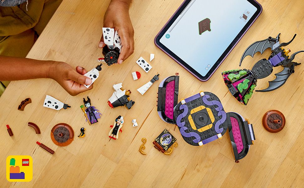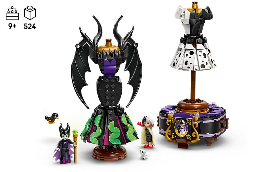 - Fun building toy – 2 buildable dresses, 2 dress stands and a display stand with space for the Maleficent and Cruella De Vil LEGO Disney minidoll characters and 2 LEGO Disney animal characters