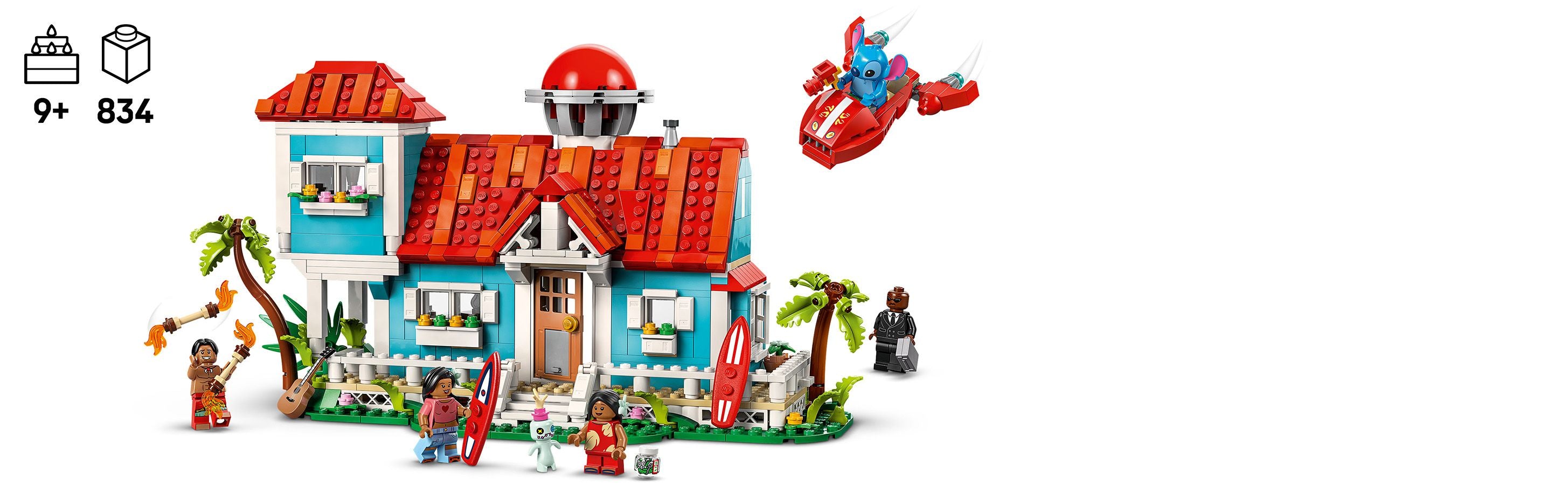- Dimensions – The beach house from the Disney hit Lilo & Stitch in this 834-piece buildable LEGO ǀ Disney set measures over 7 in. (17 cm) high, 13 in. (35 cm) wide and 5.5 in. (14 cm) deep