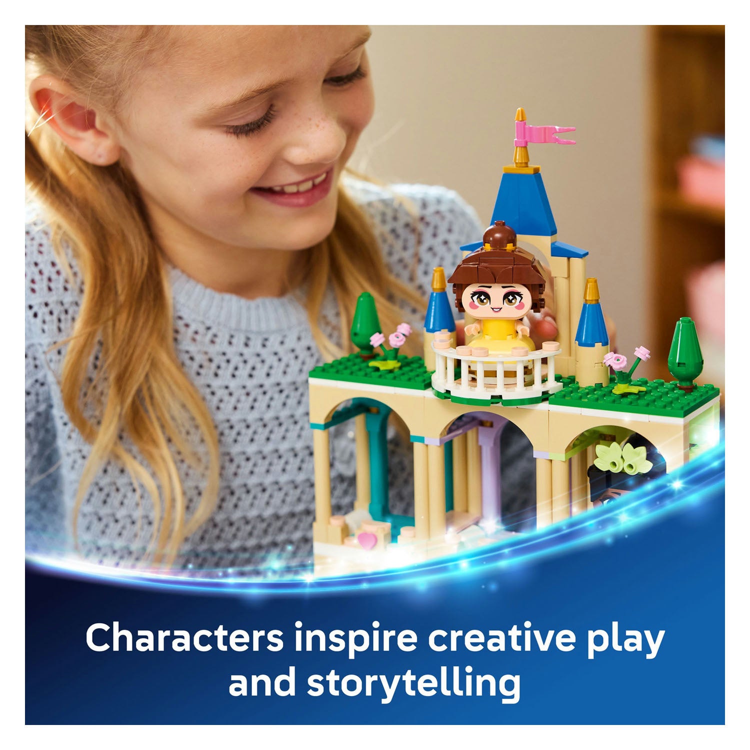 Tell new princess tales with Belle and Tiana in their castle! Create the characters and their cool castle with a surprise in the center tower and imagine the fun. Invite Belle and Tiana’s friends for playtime. There’s room in the castle, and look, the colors even match! After a round of creative storytelling play, you can put Belle and Tiana on display in their castle in your room until next time!