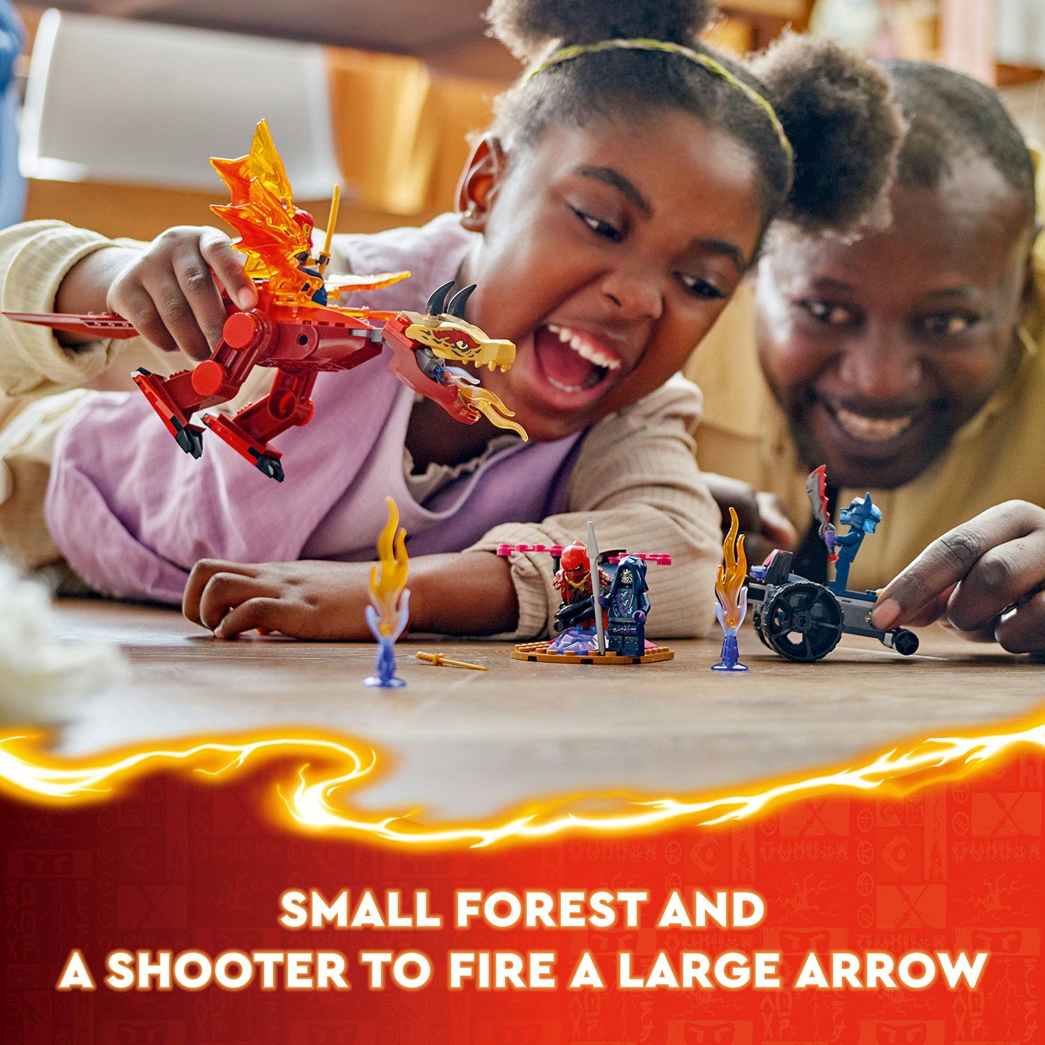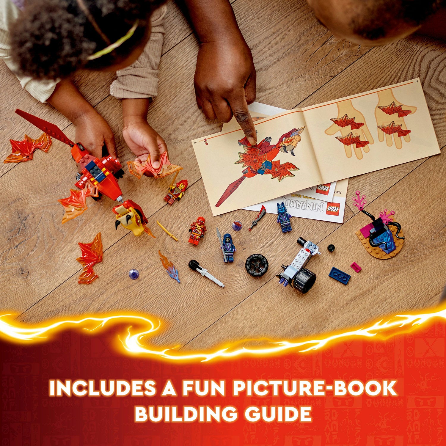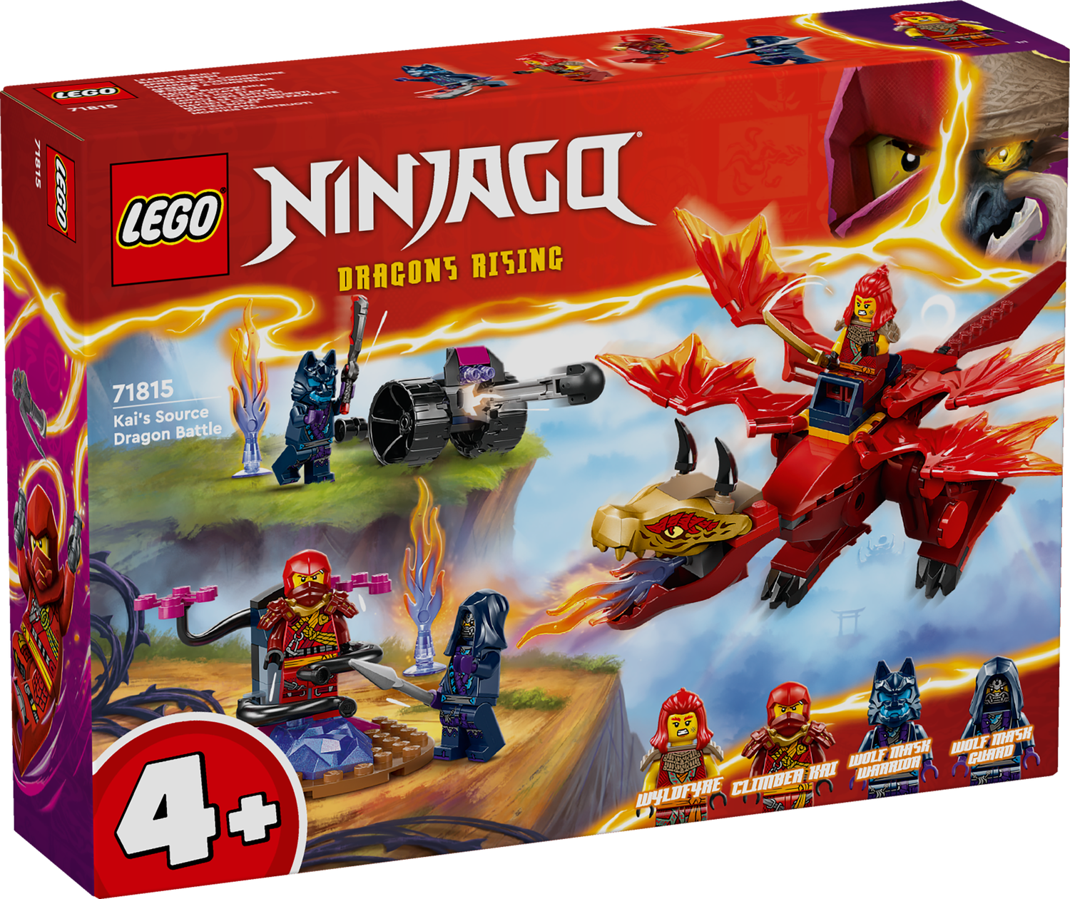 The LEGO?? NINJAGO?? Kai?€?s Source Dragon Battle (71815) adventure playset helps kids aged 4+ learn how to build while they enjoy exciting ninja adventures in the NINJAGO universe. This action toy features a red dragon model that kids can pose by moving its jaw, head, tail, legs and 4 wings. Kids can also place a fire element in its mouth to scare villains.