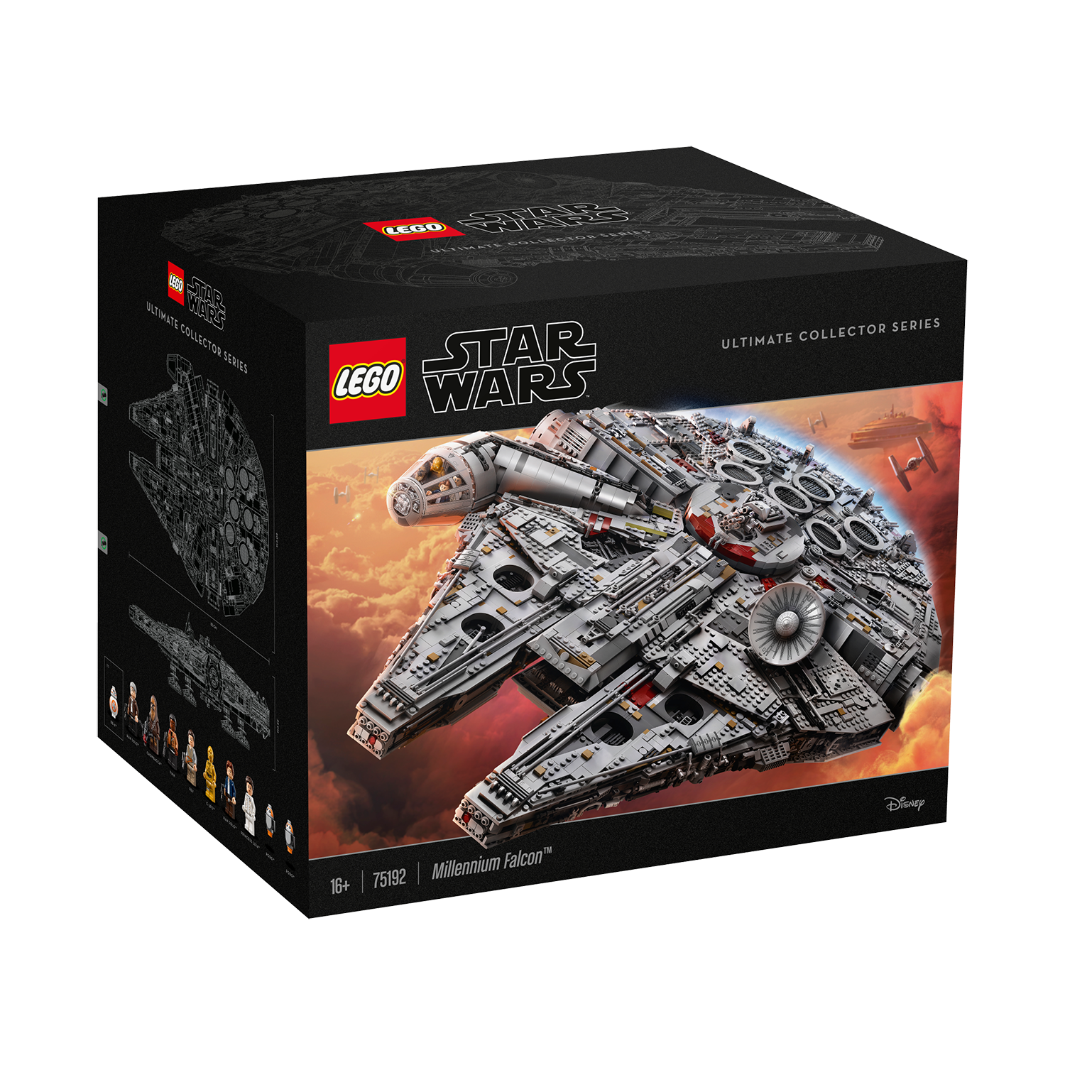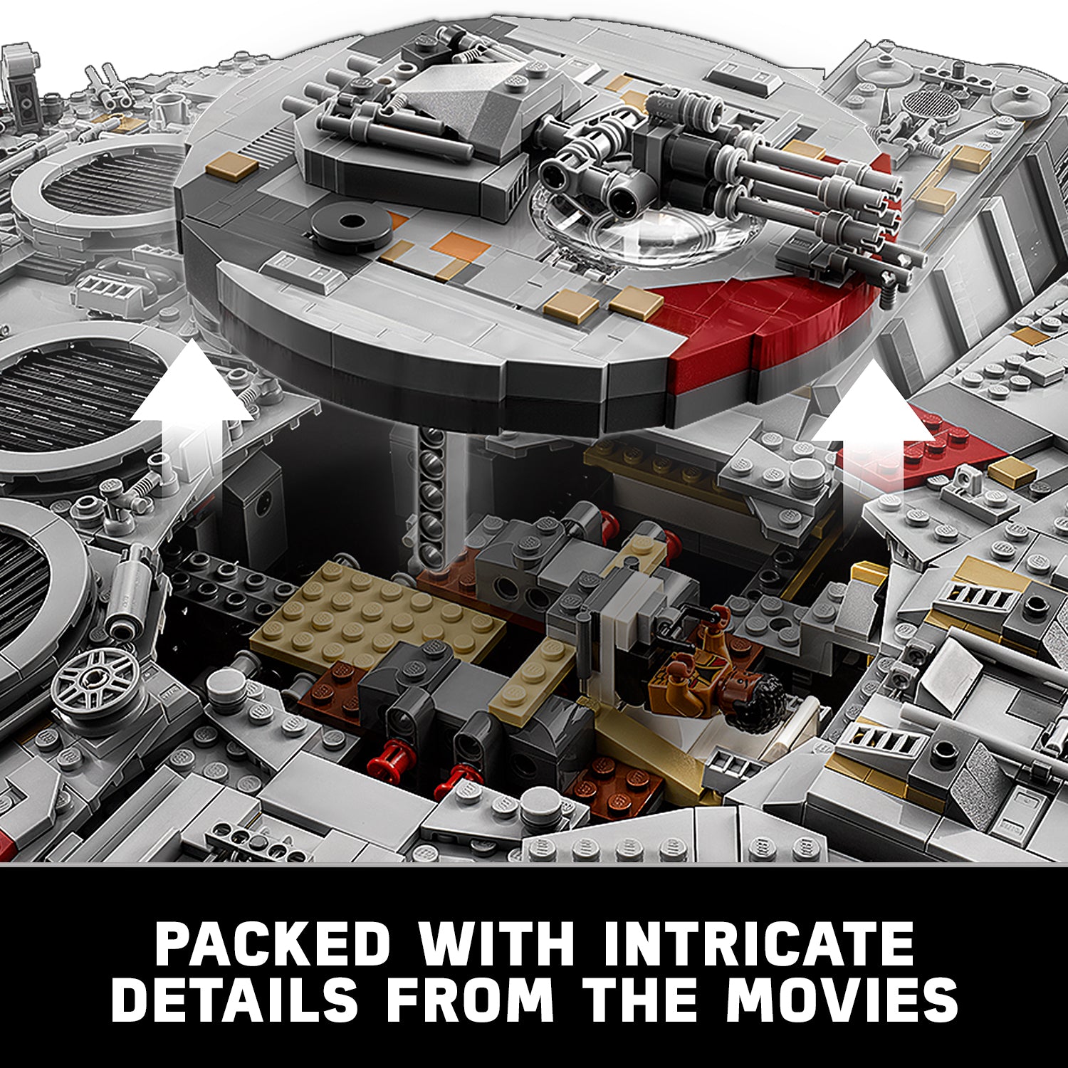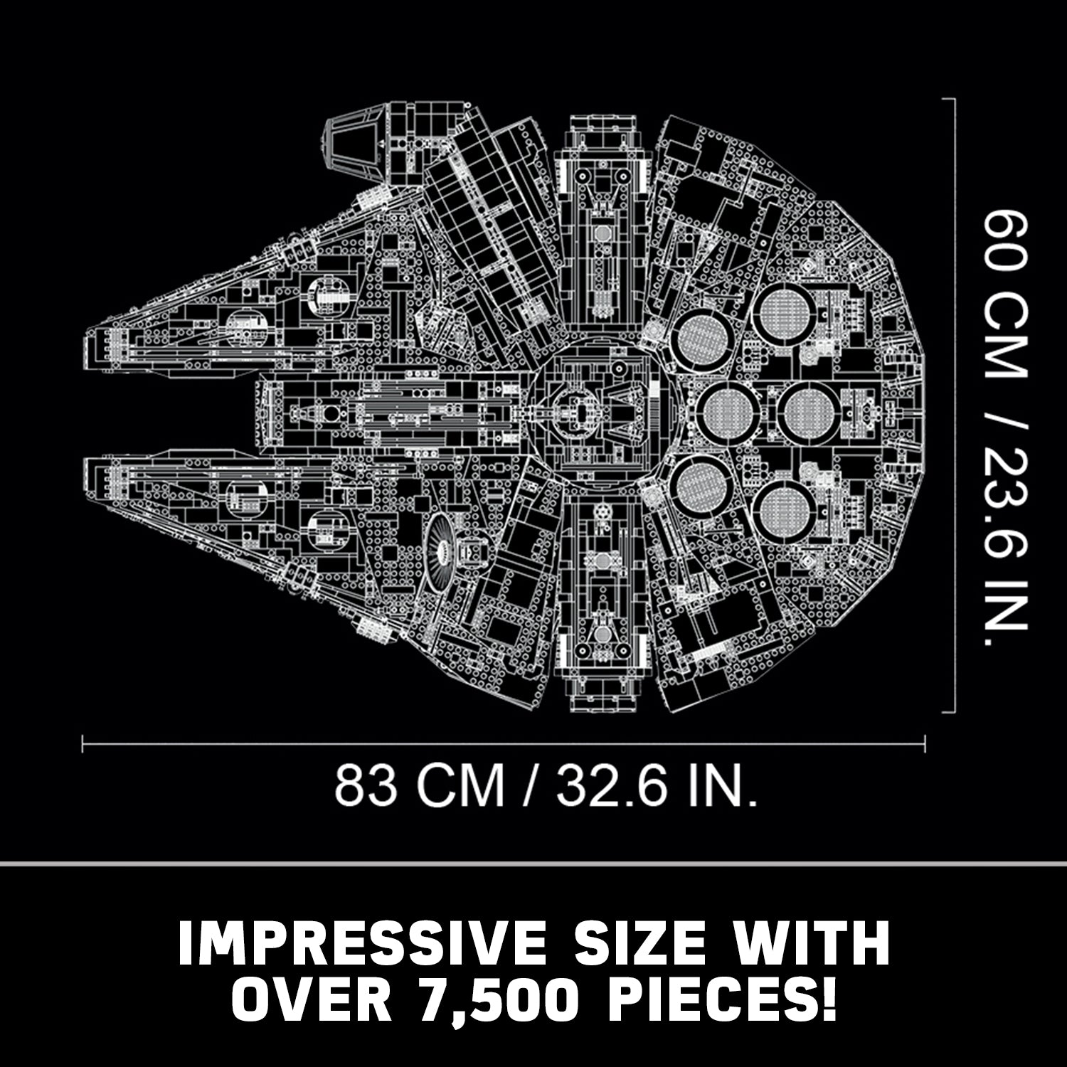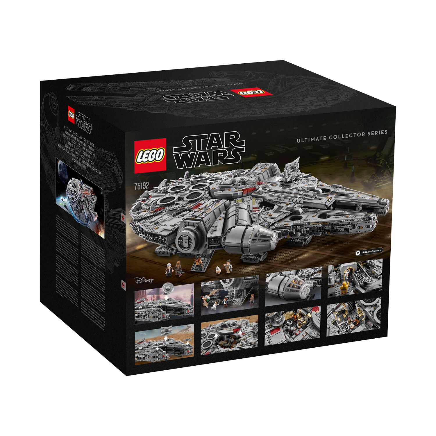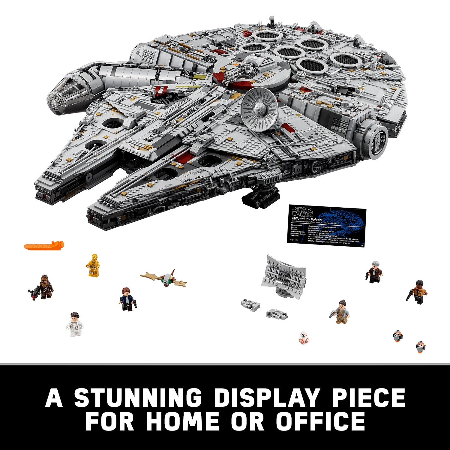 Welcome to the largest, most detailed LEGO® Star Wars Millennium Falcon model we’ve ever created—in fact, with 7,500 pieces it’s one of our biggest LEGO models, period! This amazing LEGO interpretation of Han Solo’s unforgettable Corellian freighter has all the details that Star Wars fans of any age could wish for, including intricate exterior detailing, upper and lower quad laser cannons, landing legs, lowering boarding ramp and a 4-minifigure cockpit with detachable canopy. Remove individual hull plates to reveal the highly detailed main hold, rear compartment and gunnery station. This amazing model also features interchangeable sensor dishes and crew, so you decide whether to play out classic LEGO Star Wars adventures with Han, Leia, Chewbacca and C-3PO, or enter the world of Episode VII and VIII with older Han, Rey, Finn and BB-8!