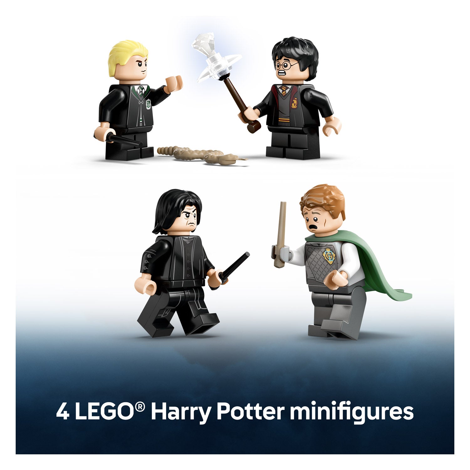 - 4 LEGO? Harry Potter? characters ? Harry Potter and Draco Malfoy? minifigures, each with a wand and magic spell elements, plus Gilderoy Lockhart? and Severus Snape? minifigures